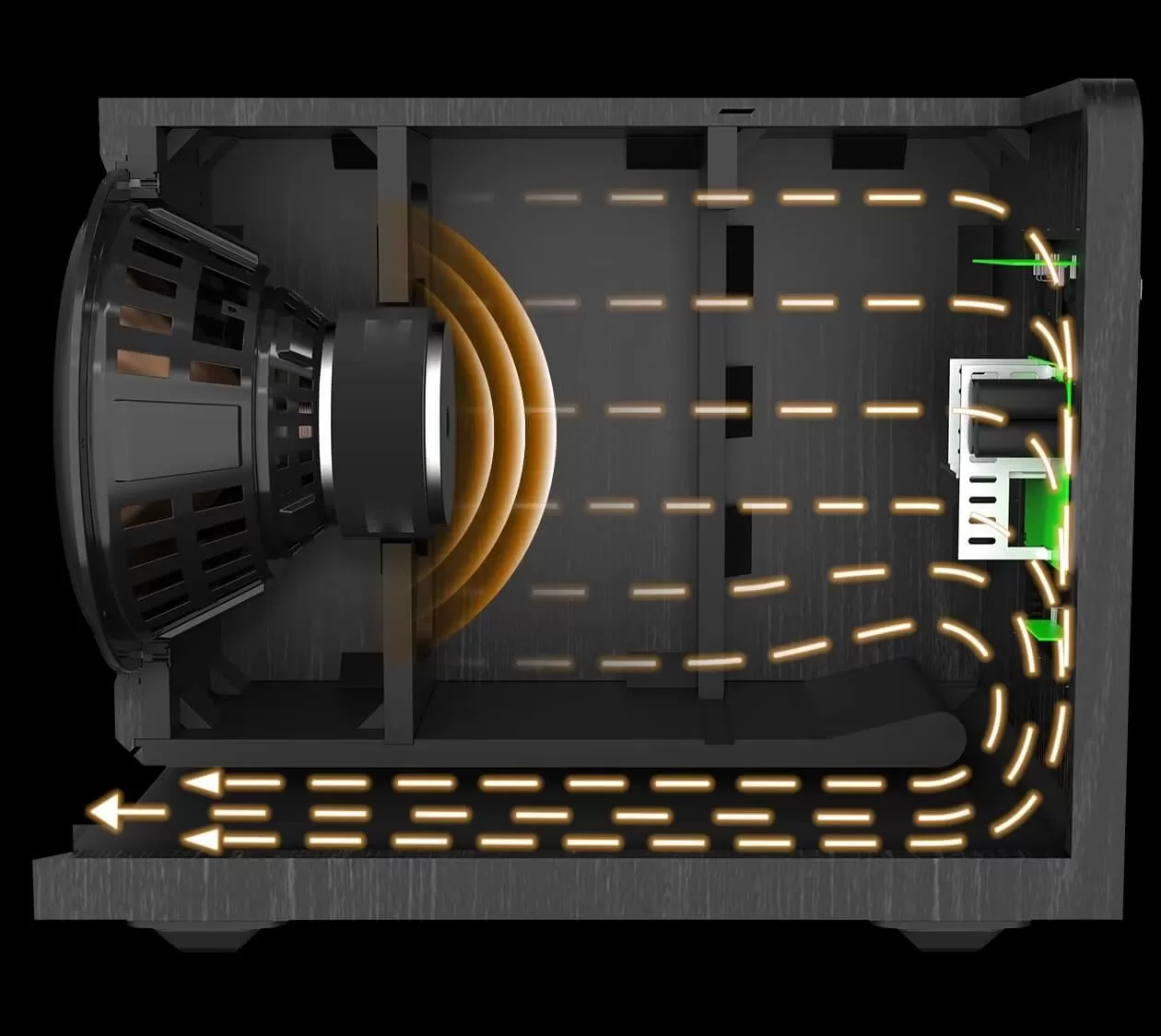 Subwoofer củ loa mặt trước và thoát hơi cổng trước